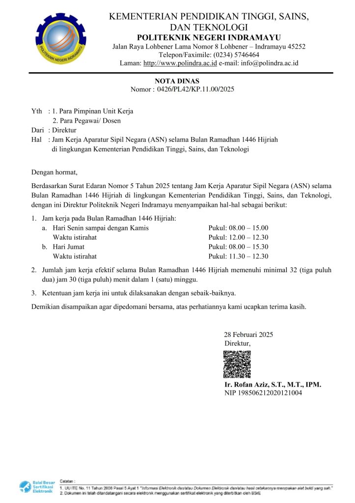 Penyesuaian Jam Kerja ASN Selama Ramadhan 1446 H di Lingkungan Kementerian Pendidikan Tinggi, Sains, dan Teknologi Indramayu – Menjelang bulan suci Ramadhan 1446 Hijriah, Politeknik Negeri Indramayu menyesuaikan jam kerja bagi Aparatur Sipil Negara (ASN) di lingkungan kampus. Kebijakan ini merujuk pada Surat Edaran Nomor 5 Tahun 2025 tentang Jam Kerja ASN selama Bulan Ramadhan […]