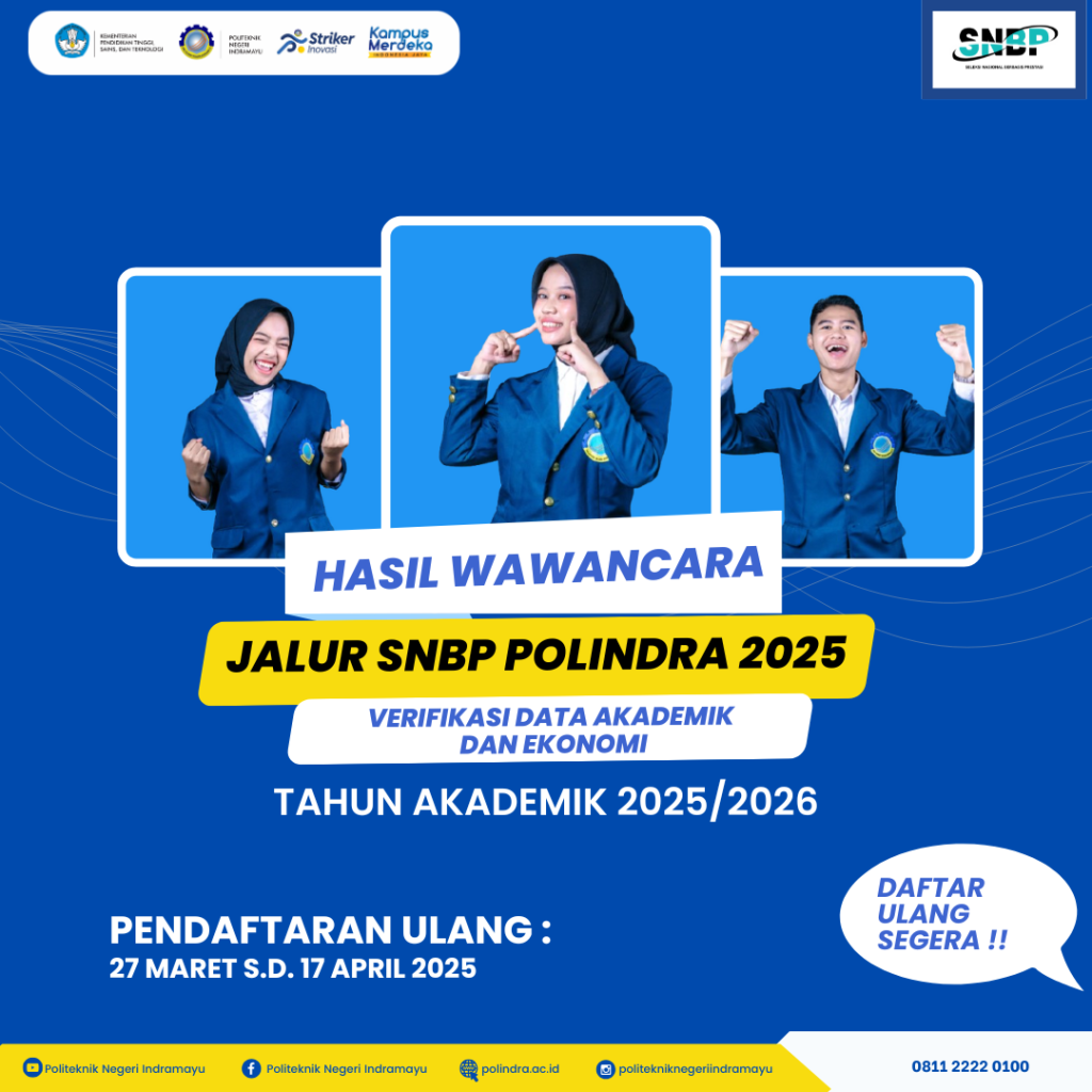 HASIL VERIFIKASI DATA AKADEMIK DAN EKONOMI PENERIMAAN MAHASISWA BARU JALUR SNBP TAHUN AKADEMIK 2025/2026 DI POLITEKNIK NEGERI INDRAMAYU Indramayu, 27 Maret 2025 – Politeknik Negeri Indramayu (Polindra) secara resmi mengumumkan hasil verifikasi data akademik dan ekonomi bagi calon mahasiswa baru yang diterima melalui jalur Seleksi Nasional Berdasarkan Prestasi (SNBP) untuk Tahun Akademik 2025/2026. Pengumuman ini […]
