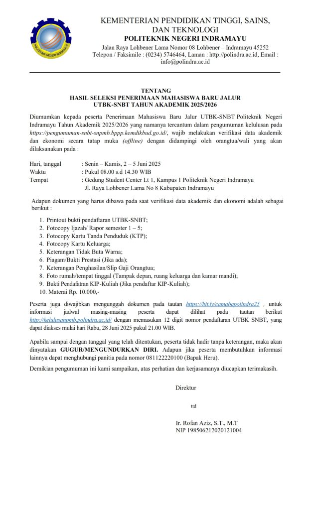 HASIL SELEKSI PENERIMAAN MAHASISWA BARU JALUR UTBK-SNBT TAHUN AKADEMIK 2025/2026 Diumumkan kepada peserta Penerimaan Mahasiswa Baru Jalur UTBK-SNBT Politeknik Negeri Indramayu Tahun Akademik 2025/2026 yang namanya tercantum dalam pengumuman kelulusan pada https://pengumuman-snbt-snpmb.bppp.kemdikbud.go.id/, wajib melakukan verifikasi data akademik dan ekonomi secara tatap muka (offline) dengan didampingi oleh orangtua/wali yang akan dilaksanakan pada : Hari, tanggal : […]