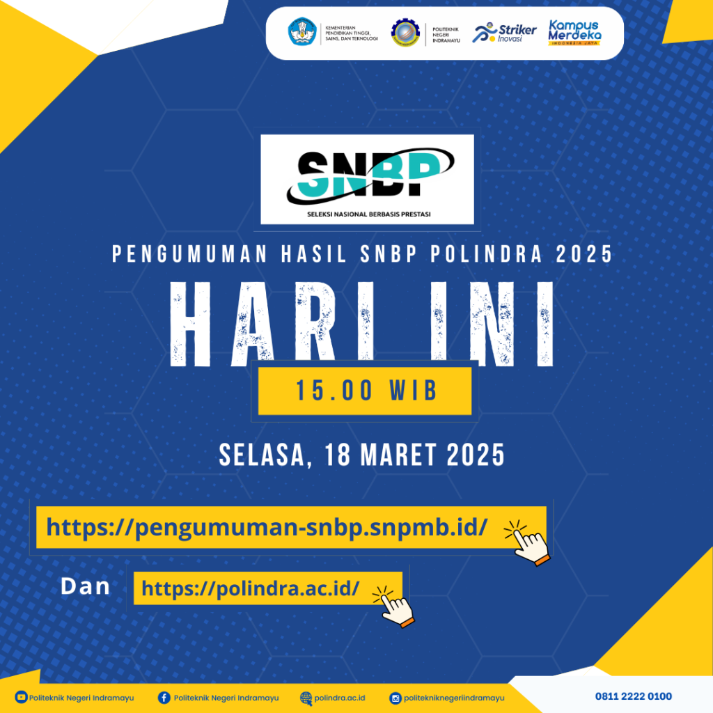 PENGUMUMAN HASIL SNBP POLINDRA 2025 Hari yang ditunggu-tunggu telah tiba! Hasil Seleksi Nasional Berdasarkan Prestasi (SNBP) Politeknik Negeri Indramayu 2025 akan diumumkan HARI INI, Selasa, 18 Maret 2025, pukul 15.00 WIB. Untuk mengecek hasil seleksi, peserta dapat mengakses melalui tautan berikut: https://pengumuman-snbp.snpmb.id/https://polindra.ac.id/ Selamat bagi peserta yang dinyatakan lulus! Bagi yang belum berhasil, tetap semangat dan […]