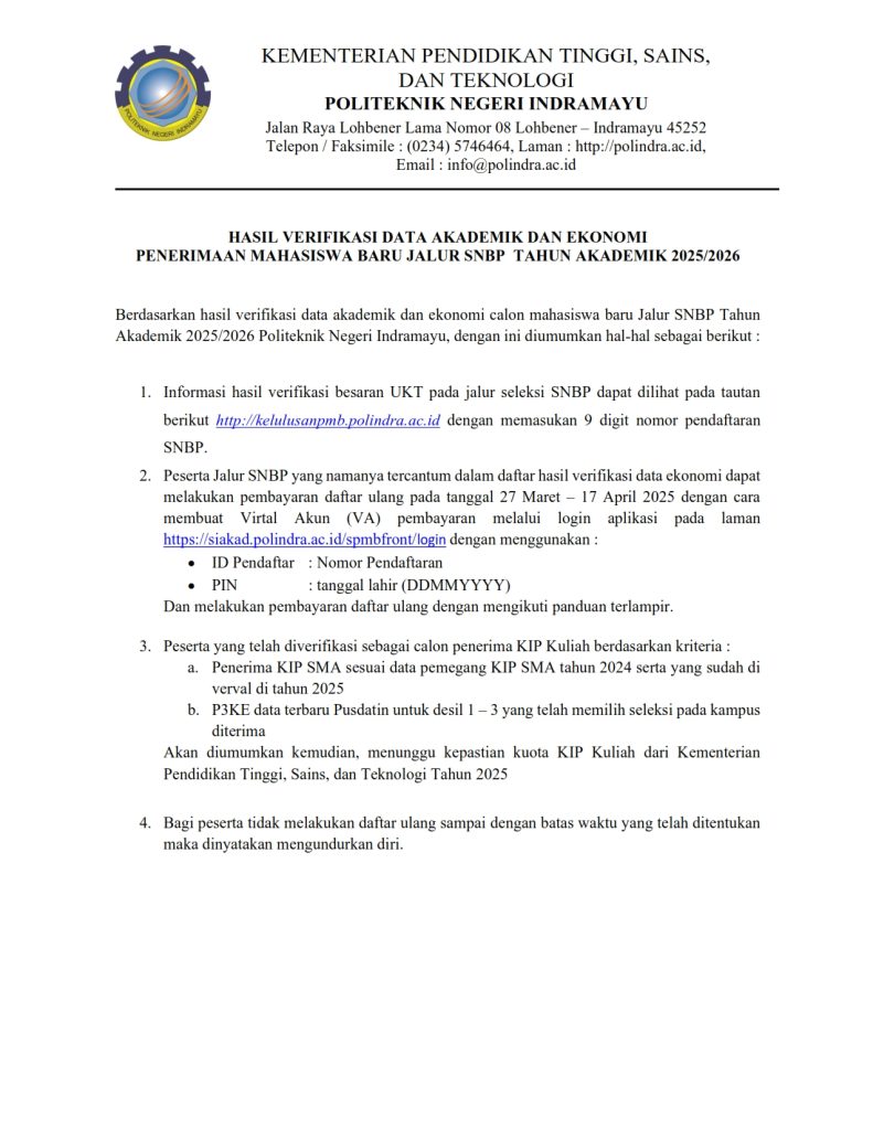 PENGUMUMAN HASIL SNBP POLINDRA 2025
