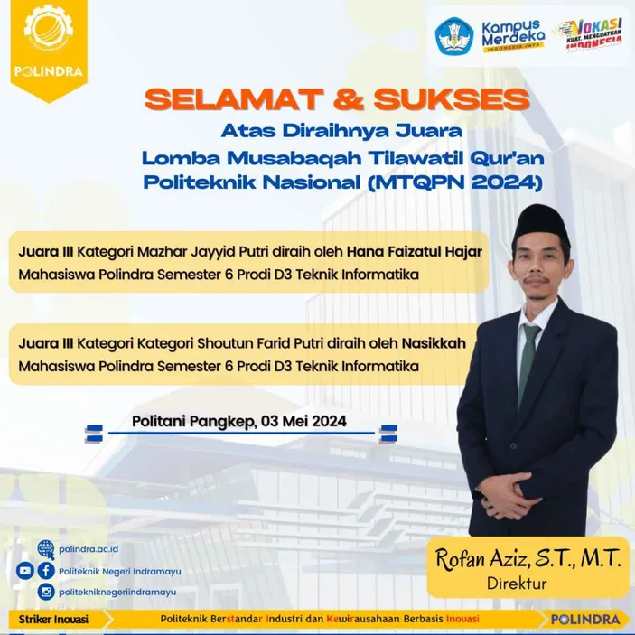 Di tengah semaraknya Lomba Musabaqah Tilawatil Qur’an Politeknik Nasional (MTQPN) 2024, dua mahasiswa dari Program Studi Diploma Tiga (D3) Teknik Informatika (TI) Politeknik Negeri Indramayu berhasil menyita perhatian dengan pencapaian luar biasa mereka. Hana Faizatul Hajar dan Nasikkah, keduanya merupakan mahasiswa semester 6, masing-masing berhasil meraih juara III dalam kategori yang berbeda. Hana Faizatul Hajar, […]