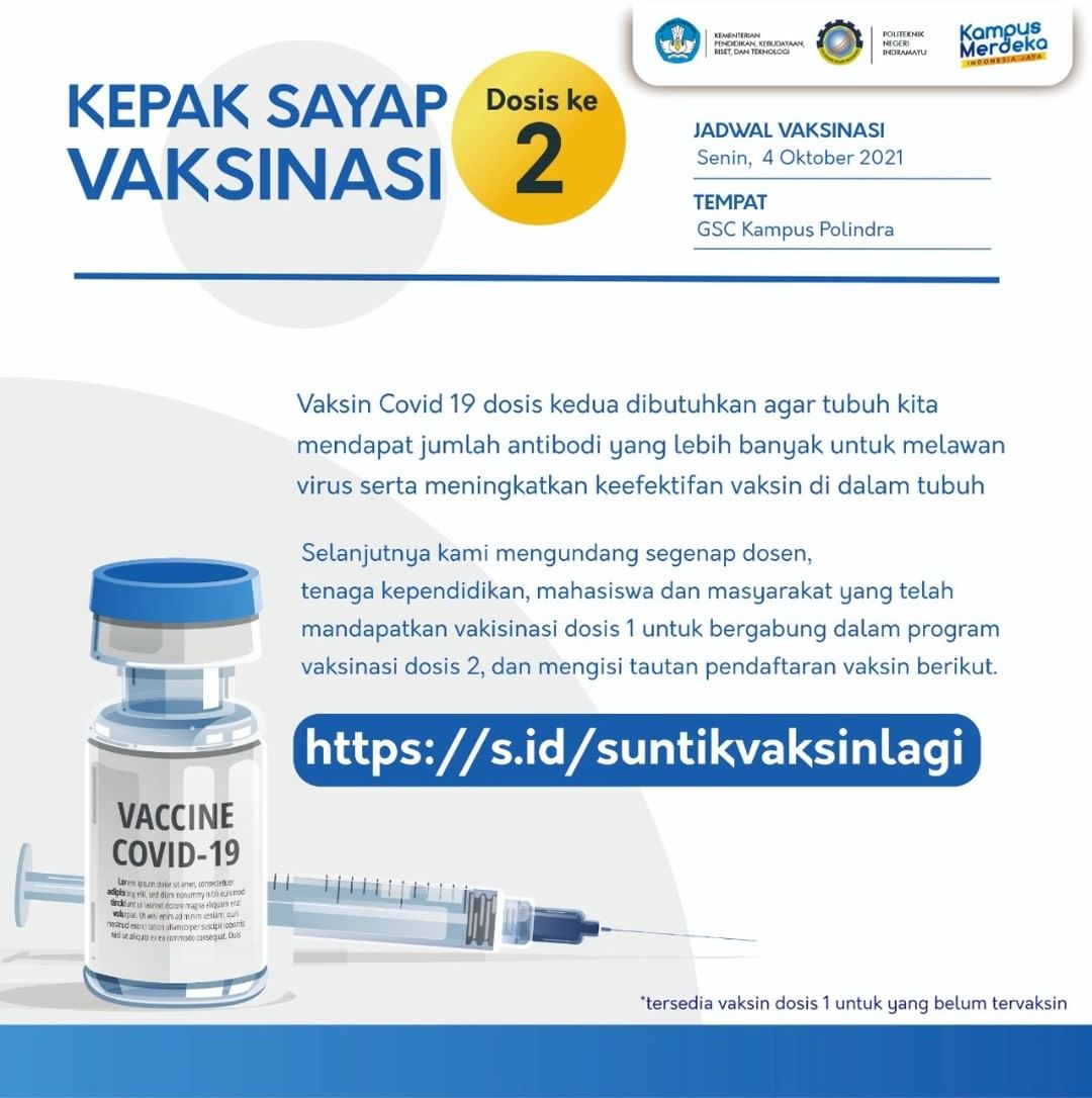 Politeknik Negeri Indramayu bersama Dinas Kesehatan Kabupaten Indramayu akan menyelenggarakan vaksinasi Dosis Kedua yang akan dilakukan pada Senin, 4 Oktober 2021 di Gedung Student Center Polindra Kampus 1 mulai pukul 08.00 WIB.