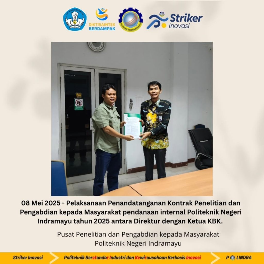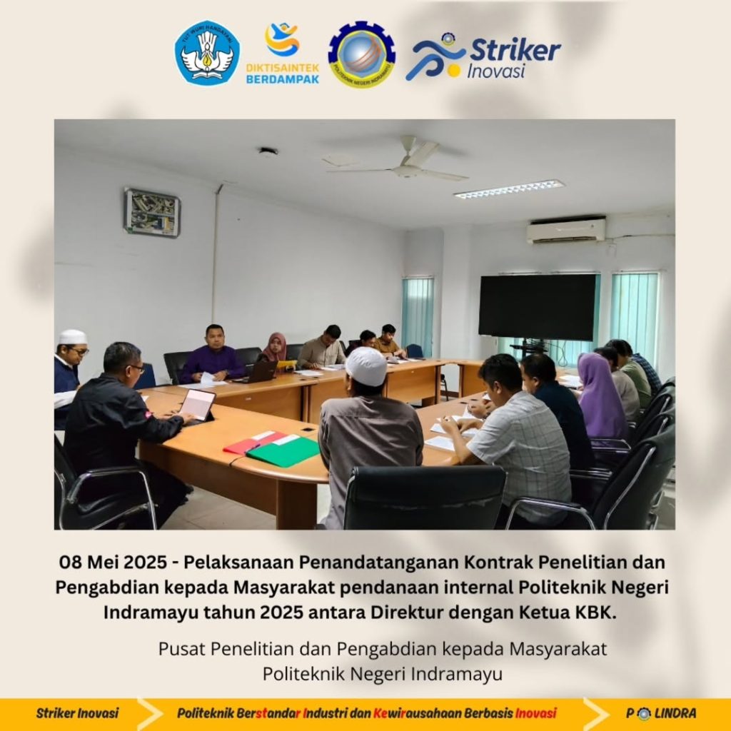 Politeknik Negeri Indramayu (Polindra) kembali menunjukkan komitmennya dalam memperkuat pilar Tri Dharma Perguruan Tinggi melalui pelaksanaan kegiatan penandatanganan kontrak Penelitian dan Pengabdian kepada Masyarakat untuk Tahun Anggaran 2025. Acara ini berlangsung khidmat di Ruang Rapat lantai 1 Gedung Direktorat Polindra dan dihadiri oleh sejumlah pejabat struktural serta para dosen penerima pendanaan internal.