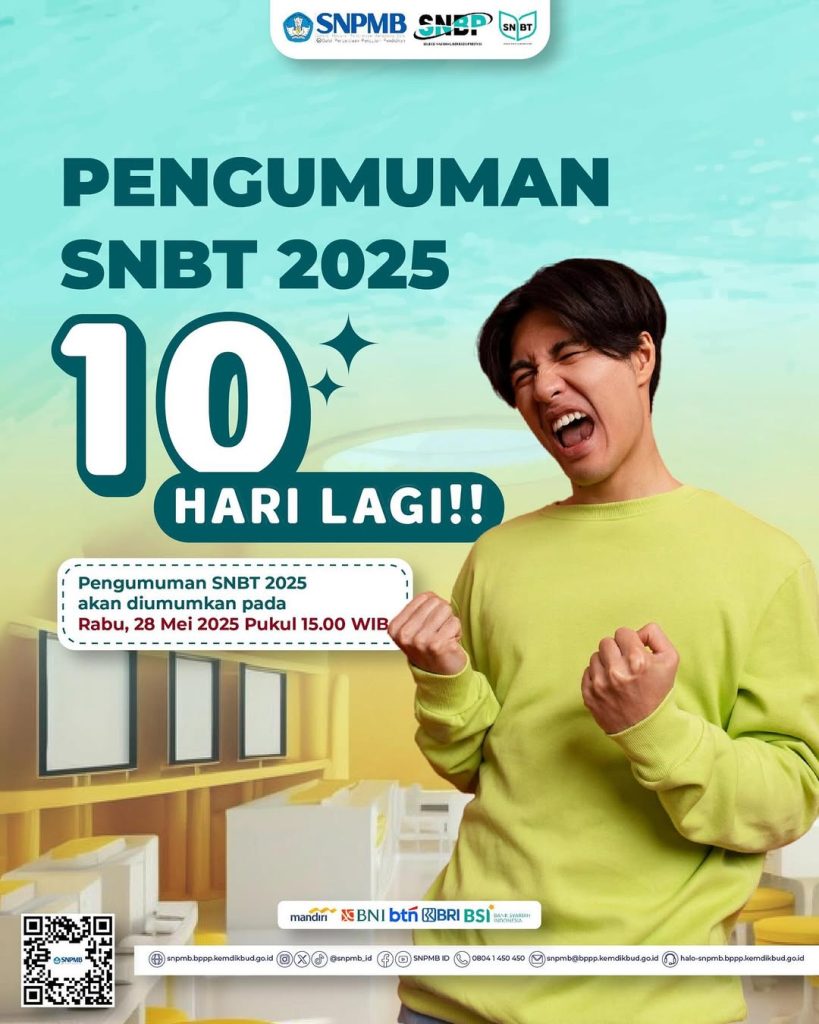 Indramayu, 18 Mei 2025 – Panitia Seleksi Nasional Penerimaan Mahasiswa Baru (SNPMB) mengumumkan bahwa hasil Seleksi Nasional Berdasarkan Tes (SNBT) 2025 akan resmi diumumkan dalam 10 hari ke depan, tepatnya pada Rabu, 28 Mei 2025 pukul 15.00 WIB.